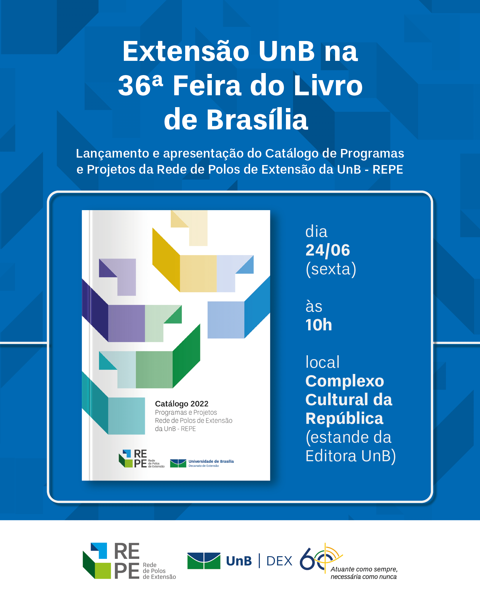 A Extensão também vai marcar presença na 36ª Feira do Livro de Brasília (Felib). Na sexta (24), às 10h, o Decanato de Extensão vai apresentar o Catálogo de Programas e Projetos da Rede de Polos de Extensão da Universidade de Brasília (REPE). O catálogo reúne informações sobre os 61 projetos que atuam nos cinco Polos – Estrutural, Recanto das Emas, Paranoá, território Kalunga (que está nos municípios de Cavalcante, Teresina de Goiás e Monte Alegre, em Goiás) e Chapada dos Veadeiros (em Alto Paraíso, Goiás).